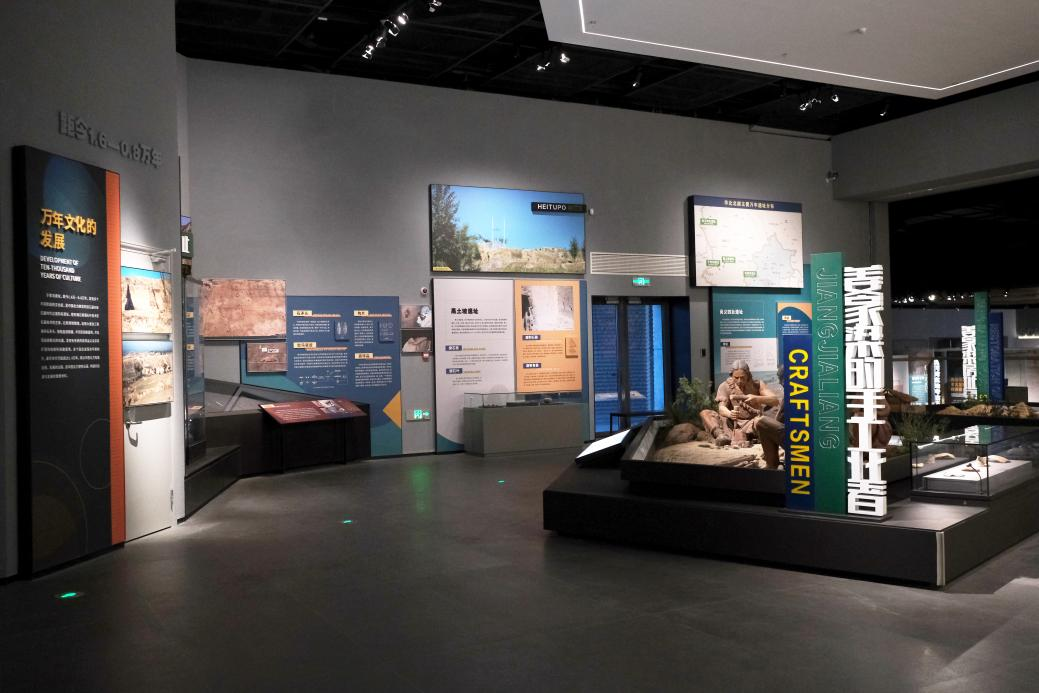 考古现场复原:复原马圈沟遗址“东方人类第一餐”场景,再现古人类肢解草原猛犸象、打制石器的鲜活画面;同时展示旧石器制作工艺,以及石核、石球等标志性石器。聚焦文明演进:陈列于家沟遗址1.4万年早期陶片、姜家梁遗址玉猪龙等关键文物,结合史前文化“三岔口”示意图,解读北方文明从旧石器时代向新石器时代过渡的脉络,凸显泥河湾在中原与北方文化交流中的核心地位。