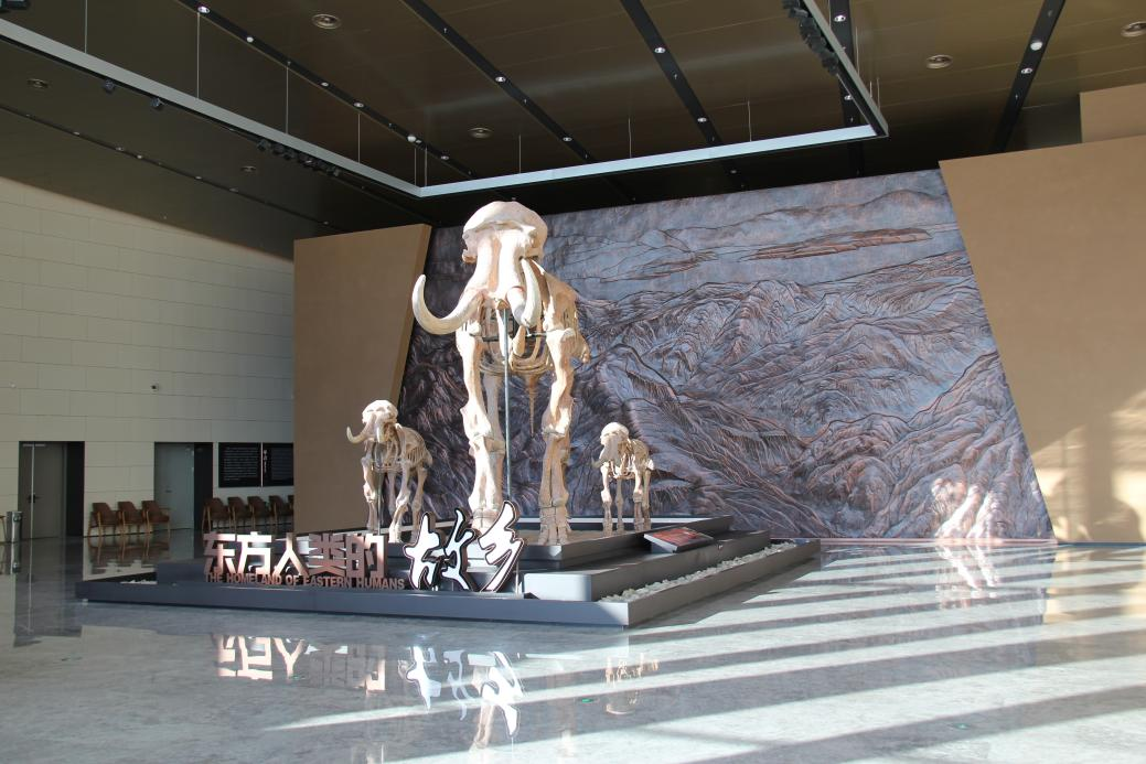 序厅震撼开篇:以巨型浮雕再现泥河湾古湖盛景与人类活动剪影,1大2小草原猛犸象骨架及脚印化石,再现马圈沟遗址出土的最早草原猛犸象场景,重塑华北是草原猛犸象的起源地,呈现“东方人类故乡”的远古底蕴。
